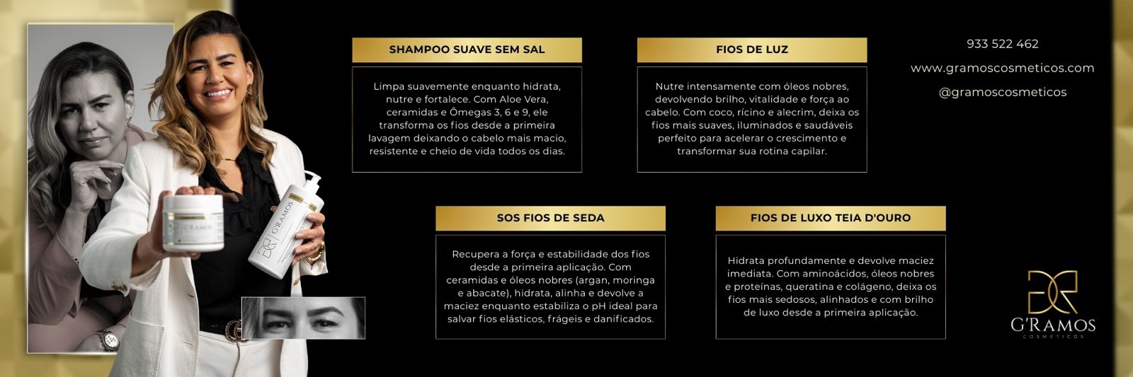 Giovana Ramos é cabelereira há mais de 15 anos, especialista em tratamentos capilares e apaixonada por transformar a auto estima das pessoas. A partir da experiência no salão e da necessidade real que via nos cabelos das clientes, Ela criou a G’Ramos cosméticos, uma